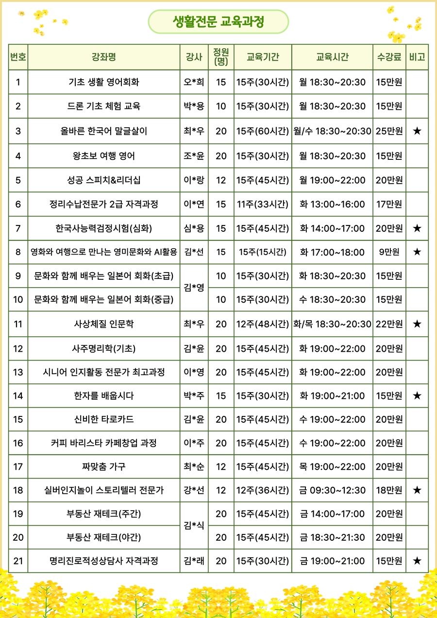 4. 평생교육원 사정에 따라 수업 일정 / 강사 / 모집정원 등이 변경될 수 있습니다.
