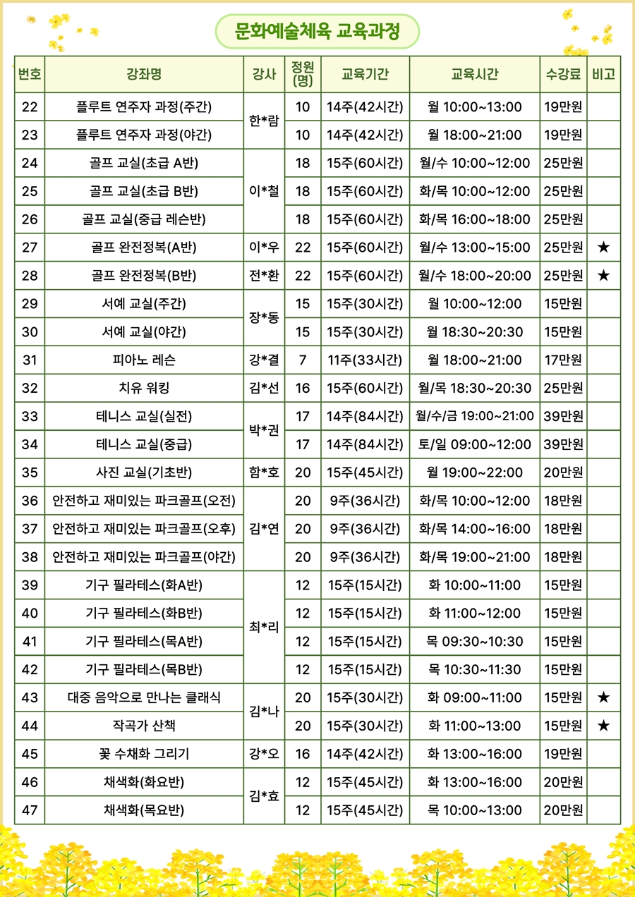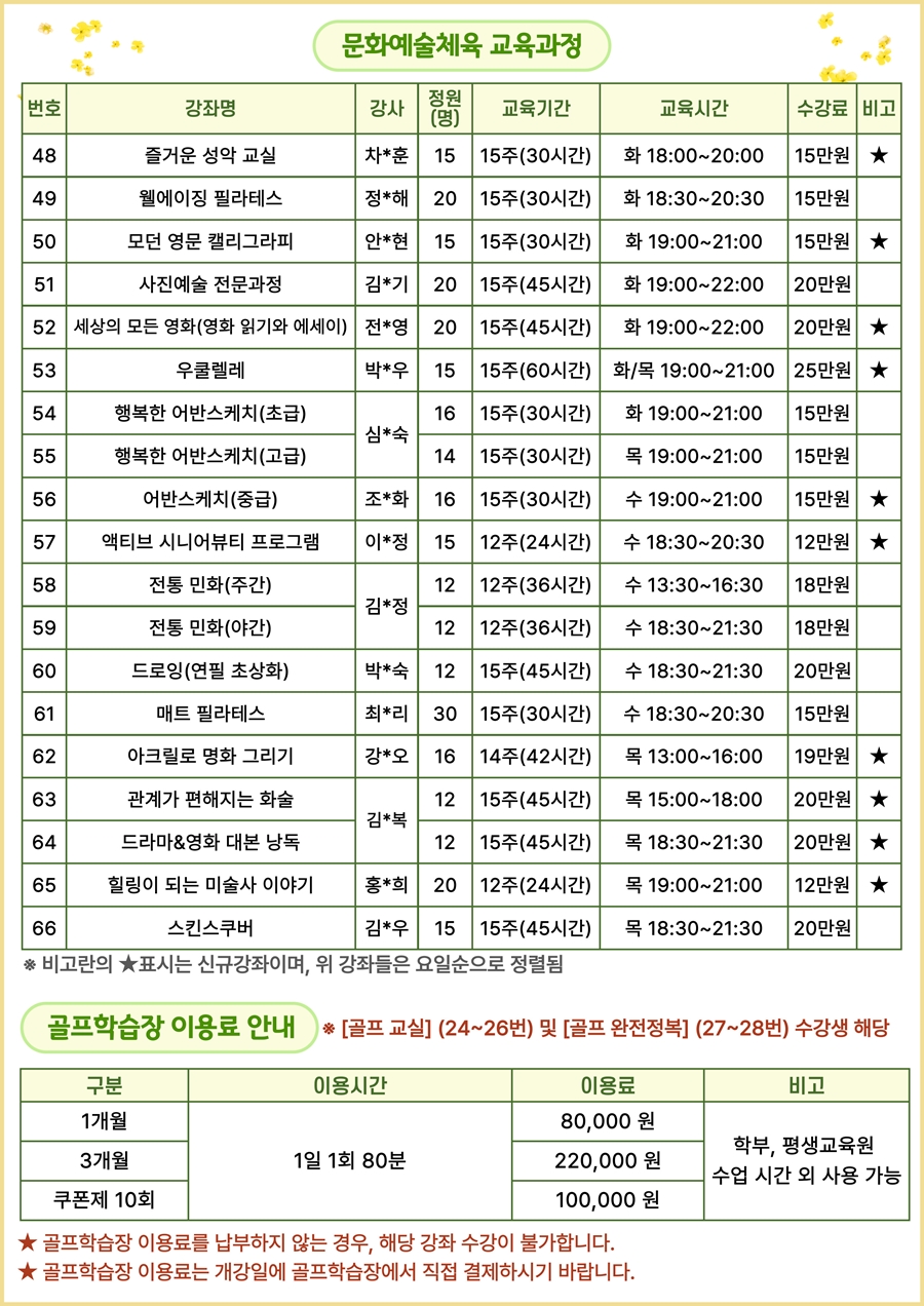- 전 강좌 성인만 등록 가능하며, 온라인(홈페이지) 으로만 신청 가능합니다. ※ 전화 및 방문접수 불가
